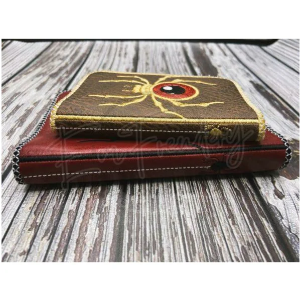 The smaller fits the 5X7 hoop and uses a mini-composition notebook. The larger fits a 6X10 hoop and uses an A6 size notebook.