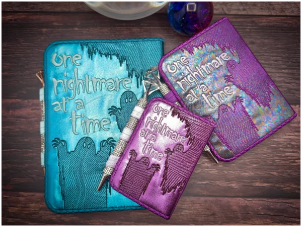 The smallest fits the 5X7 hoop and uses a mini composition notebook. The middle size fits a 6X10 hoop and uses an A6 size notebook. The largest size fits a 9X14 hoop and uses an A5 size notebook.