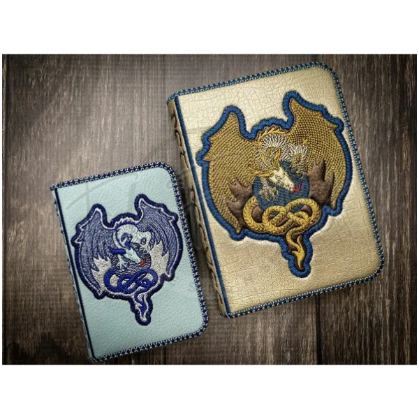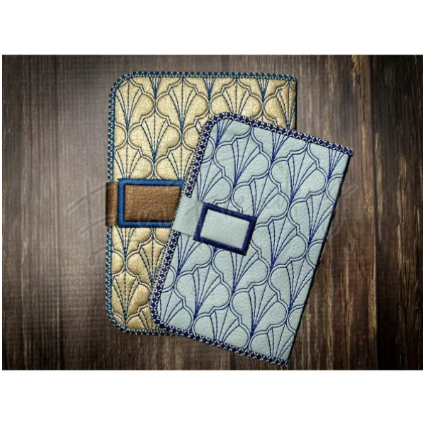 The smaller fits the 5X7 hoop and uses a mini composition notebook. The larger fits a 6X10 hoop and uses an A6 size notebook.